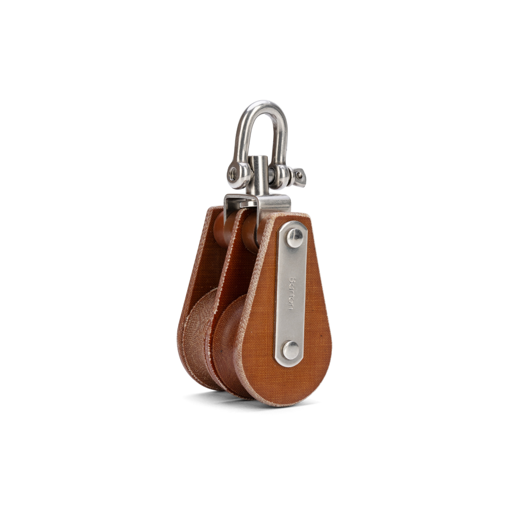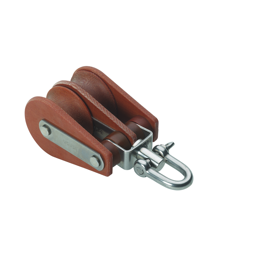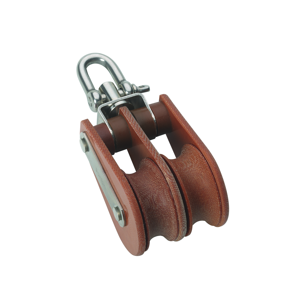 Klassischer 2-scheibiger Block mit Wirbel aus seewasserbeständigem Tufnol (Hartgewebe) und mit Edelstahl Beschlägen, für 14 mm Tau. Die Blöcke zeichnen sich durch ihre Langlebigkeit, UV-Beständigkeit sowie ihrem geringen Eigengewicht aus.
