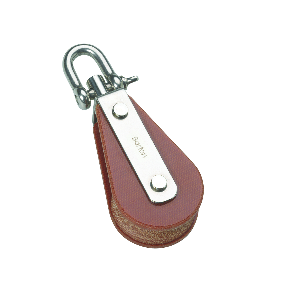 Klassischer 1-scheibiger Block mit Wirbel aus seewasserbeständigem Tufnol (Hartgewebe) und mit Edelstahl Beschlägen, für 16 mm Tau. Die Blöcke zeichnen sich durch ihre Langlebigkeit, UV-Beständigkeit sowie ihrem geringen Eigengewicht aus.