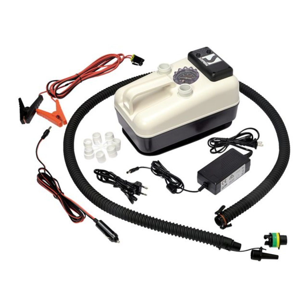 Tragbare, effiziente und geräuscharme elektrische Luftpumpe. Die Pumpe schaltet sich automatisch ab, wenn der gewünschte Druck erreicht ist. Eine LED-Anzeige zeigt den Status des Drucks an. Die integrierte 12-V-Batterie kann über einen Zigarettenanschluss oder einen Standard-110/240-V-Anschluss wieder aufgeladen werden.