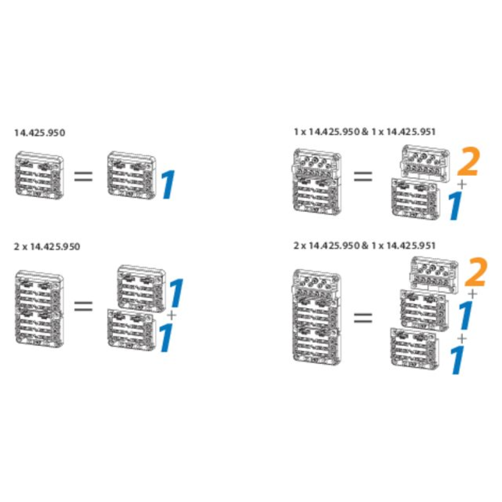 Ein modulares System, das Sicherungshalter und Sammelschiene auf einfache Weise zu einer Einheit kombiniert. Mit den beiden Geräten sind vier verschiedene Konfigurationen möglich (siehe Bilder).