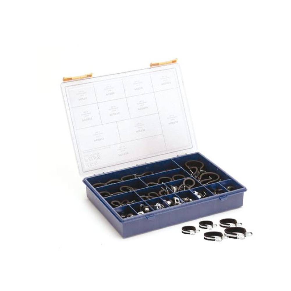 Sortimentsbox Hi Grip P-Clips, Edelstahl 304 AISI / A2. Insgesamt 104 Stück in den Maßen 5mm, 6mm, 8mm, 10mm, 13mm, 16mm, 19mm, 21mm, 25mm, 29mm und 35mm. Perfekt für die Montage von Rohren und Kabeln.