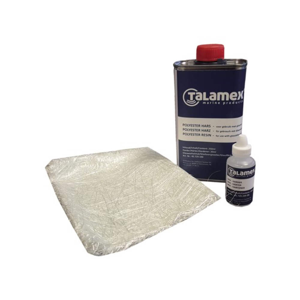 Das Set besteht aus 250g Harz, 20ml MEK Härter und 0,5m² Glasfasermatte für kleinere Reparaturen.