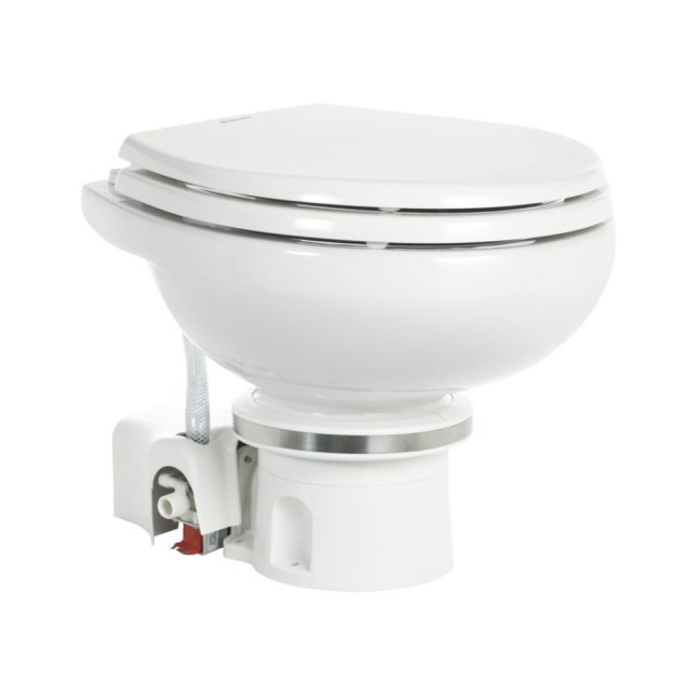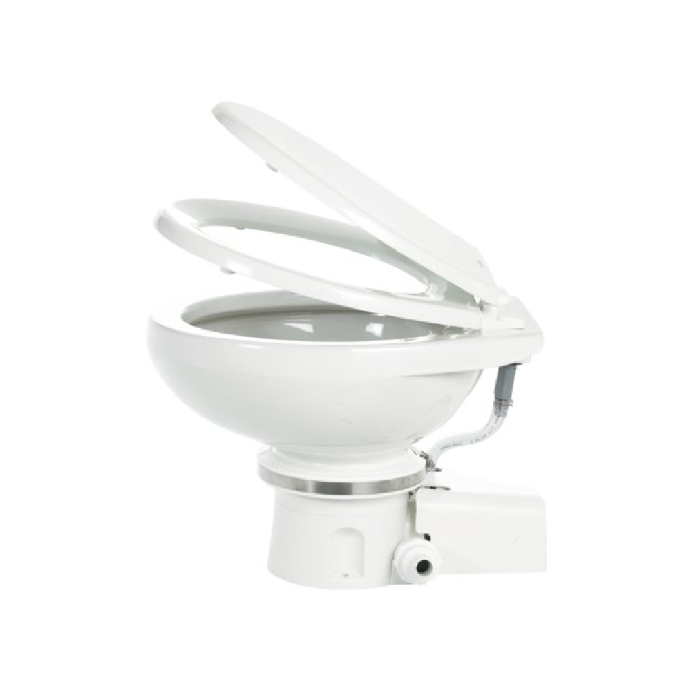 Elektrotoilette mit 360° ORBIT Sockel-Technologie in 12V, Seewasserspülung. Hochwertiges Keramikbecken. 360° ORBIT-Installation zur Fixierung des Sockels in jedem beliebigen Winkel zum Becken. Sockel passt perfekt an bestehende Anschlüsse gängiger Toilettenmodelle. Hocheffizientes Zerhackersystem mit 10-blättrigem 2-Stufen-Edelstahlschneiderad. Frischwasser-Modelle: Integriertes elektrisches Wasserventil.