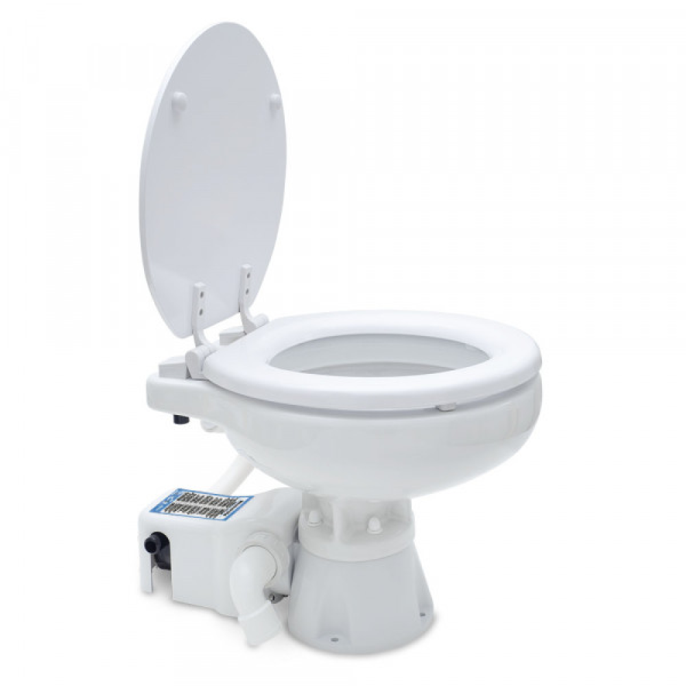 Standard-Electric Extra-Komfort-Toilette mit einem kombinierten elektrischen 12V-Mazerator und Pumpensystem für die Abfallentsorgung und Spülung in einem einzigen Vorgang. Inklusive eines elektrischen Steuerfelds mit Ein-Tasten-Bedienung. Die kleinste und leichteste auf dem Markt. Leicht zu reinigende weiße Keramikschüssel und weißer Holzsitz. Stabile Basis für eine robuste Installation. Anschlussstücke: Eingang 19mm (3/4″), Ausgang 25mm oder 38mm (1″ oder 1,5″). Plug & Play/ austauschbar mit Jabsco 37010-0090, Johnson Pump 80-47435-01, 80-47626-01 und anderen elektrisch betriebenen, kompakten Toilettenmodellen mit 12V.
