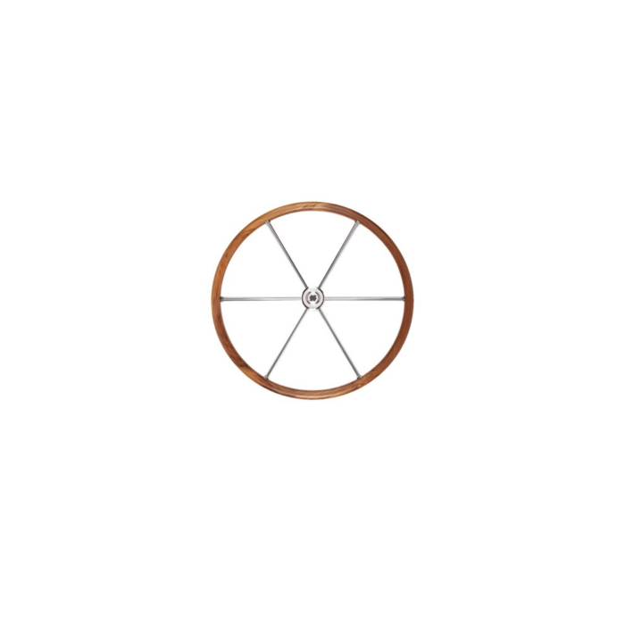Steuerrad mit Teakholzgriff und Edelstahlspeichen. Das Steuerrad hat aufgrund der Aussparungen an der Rückseite des Steuerrads einen guten Grip.